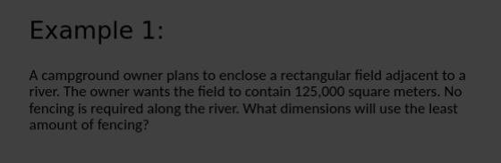 area = 989 xy = 989 y = 989/x Cost = 20.70(2x) + 20.70(2y) + 18(2x) C = 41.4x + 41.4y + 36x C = 77.4x + 41.4y C = 77.4x + 41.4(989/x) C = 77.4x + 40944.6/x C’ = 77.4x + 40944.6x^-2 0 = 77.4x + 40944.6x^-2 0 = (77.4^2 + 40944.6)/x^2 0 = 77.4x^2 - 40944.6 40944.6 = 77.4x^2 529 = x^2 23 = x