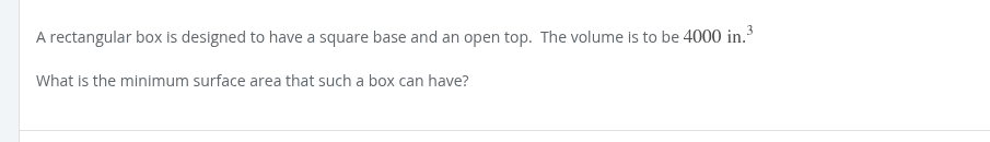 sA = bl^2 + 4(h*bl) Volume = bl^2 * h 4000 = bl^2 * h 4000/bl^2 = h sA = bl^2 + 4(4000/bl^2 * bl) sA = bl^2 + 16000/bl sA = bl^2 + 16000bl^-1 sA’ = 2bl - 16000bl^-2 0 = 2bl - 16000bl^-2 16000bl^-2 = 2bl 16000/bl^2 = 2bl 16000 = 2bl^3 8000 = bl^3 20 = bl