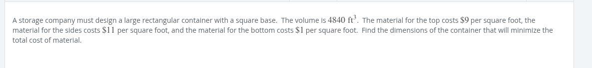80 = x^2 * y cost = 2(.60x^2) + 4(.30xy) cost = 1.2x^2 + 1.2xy y = 80/x^2 cost = 1.2x^2 + 1.2x * (80/x^2) cost = 1.2x^2 + 96/x cost’ = 2.4x - 96x^-2 -2.4x = -96x^-2 -2.4 = -96x^-3 1 = 40x^-3 x^3 = 40 x = cbrt(40) x = 3.42