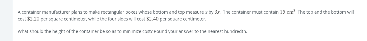 cost = 2.2(6x^2) + 2.4(2(15/x) + 2(5/x)) cost = 13.2x^2 + 4.8(15/x) + 4.8(5/x) cost = 13.2x^2 + 72/x + 24/x cost = 13.2x^2 + 96/x cost’ = 26.4x - 96x^-2 cost’ = 26.4x - 96/x^2 0 = 26.4x - 96/x^2 96/x^2 = 26.4x 96 = 26.4x^3 96/26.4 = x^3 cbrt(96/26.4) = x cbrt(40/11) = x