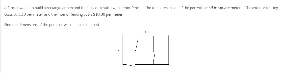 cost = 11.5(outside) + 10(inside) cost = 11.5(2x+2(3956/x) + 10(2x) cost = 11.5(2x+(7912/x)) + 20x cost = 23x + 90988/x + 20x cost = 43x + 90988/x cost’ = 43 + 90988x^-2 0 = 43 + 90988x^-2 90988x^-2 = 43 90988 = 43x^2 2116 = x^2 46 = x