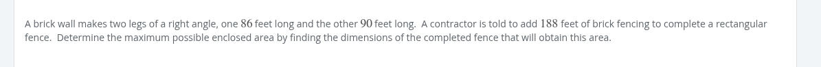 area = (86 + y-86)(90 + x-90) 188 = (y-86) + (x-90) + x + y 188 = 2x + 2y - 176 364 = 2x + 2y 182 = x + y y = 182-x area = x * (182-x) area = 182x - x^2 area’ = 182 - 2x 2x = 182 x = 91