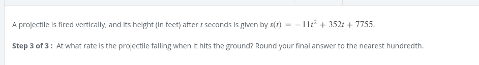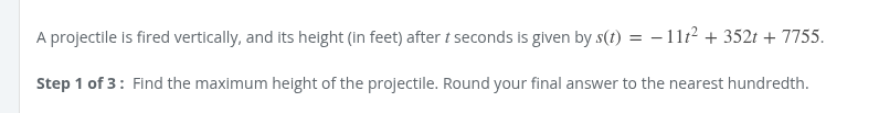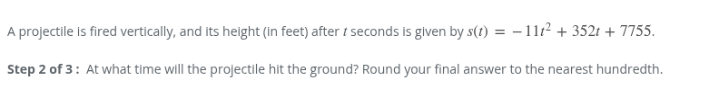 -11t^2 + 352t + 7755 t^2 - 32t - 705 (x+15)(x-47) zeros at -15 and +47 projectile hit the ground at 47.