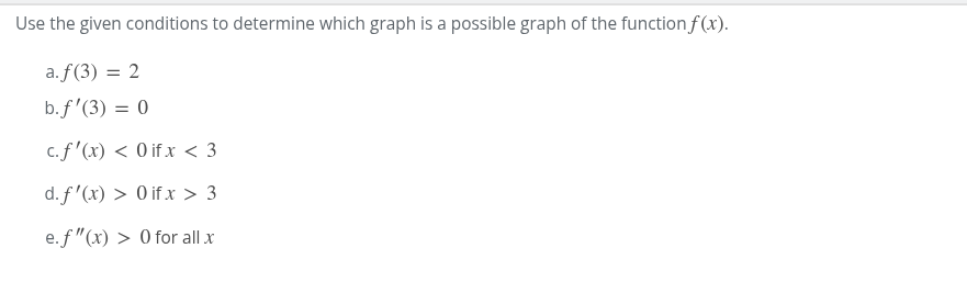 f(3) = 2 f’(3) = 0 f’(x) < 0 if x < 3 f’(x) > 0 if x > 3 f”(x) > 0 for all x