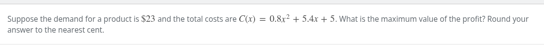 profit = revenue - cost profit = 23x - (.8x^2+5.4x +5) profit = 23x - .8x^2 - 5.4x - 5 profit = -.8x^2 + 23x - 5.4x - 5 profit = -.8x^2 + 17.6x - 5 profit’ = -1.6x + 17.6 0 = -1.6x + 17.6 1.6x = 17.6 x = 11