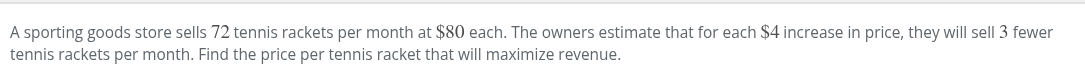 price = 80 + 4x racketssold = 72 - 3x revenue = price*racketssold revenue = (80 + 4x)(72-3x) revenue = 5760 - 240x + 288x - 12x^2 revenue = -12x^2 + 48x + 5760 revenue’ = -24x + 48 0 = -24x + 48 24x = 48 x = 2