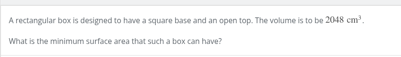 V = x^2*h 2048 = x^2 * h V = x^2 * 2048/x^2 SA = x^2 + 4hx SA = x^2 + 4(2048/x^2)x SA = x^2 + 8192/x SA’ = 2x - 8192/x^2 0 = 2x - 8192/x^2 8192/x^2 = 2x 8192 = 2x^3 4096 = x^3 16 = x