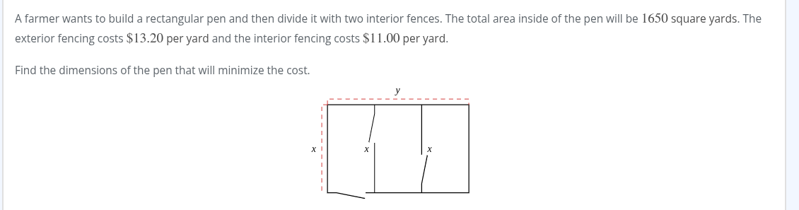 price = 13.20(2x+2(1650/x)) + 22x price = 26.4x + 43560/x +22x price = 48.4x + 43560/x price’ = 48.4 - 43560/x^2 0 = 48.4 - 43560/x^2 43560/x^2 = 48.4 43560 = 48.4x^2 900 = x^2 30 = x 1650/30 = 55 55 = y