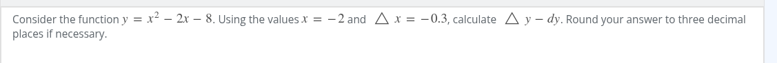 x^2-2x-8 dy = (2x - 2)dx dy = (2(-2)-2)(-.3) dy = (-4-2)(-.3) dy = (-6)(-.3) dy = 1.8