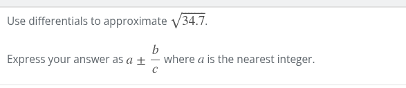 sqrt(36) = 6 x^(1/2) dy = (1/2x^(-1/2))(dx) dy = (1/2(36)^(-1/2)(-1.3) dy = (1/12)-1.3 dy = (1/12)(-13/10) dy = (-13/120)