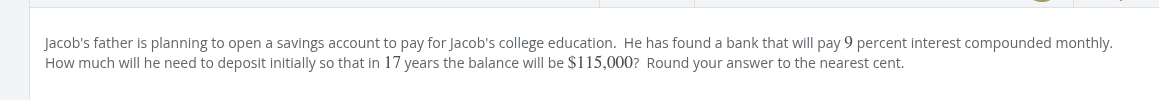 x(1+.09/12)^(12*17) = 115000 x(1.0075)^(204) = 115000 x4.59188689 = 115000 x = 25044.1708942 25044.17