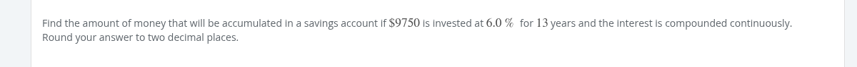 Pe^rt 9750e^(.06)(13) 9750e^.78 21269.3545886 21269.35