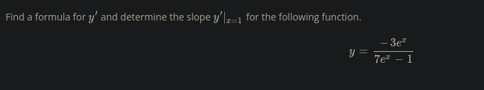 (f’g - fg’) / g^2 f = -3e^x g = 7e^x - 1 f’ = -3e^x g’ = 7e