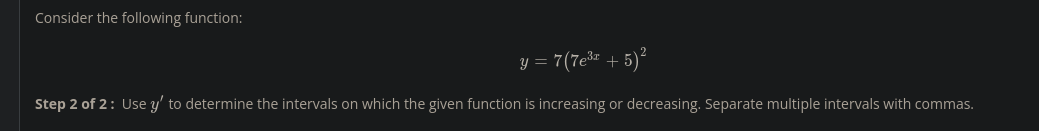 294(7e^3x+5)(e^3x) = 0 exponentials are always positive so ignore them multiply by 294 is positive always i think this is constant increasing