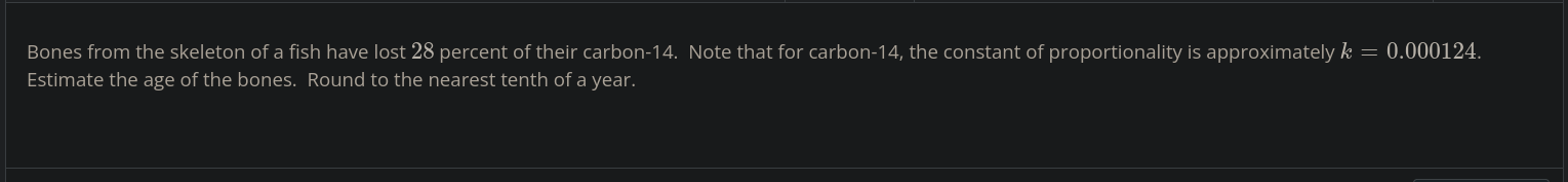 and we know its - 28% so 72 = 100e^(-.000124t) 72/100 = e^(-.000124t) ln(72/100) = -.000124t ln(72/100)/-.000124 = t 2649.22634655 = t 2649.2 = t