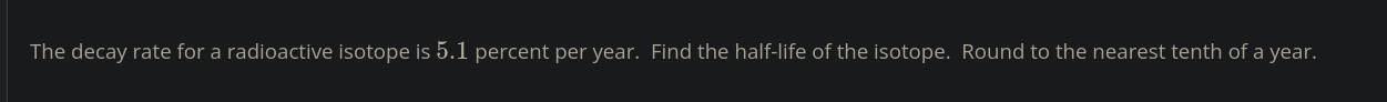 Ce^-kt 50 = 100e^(-.051t) 1/2 = e^(-.051t) ln(1/2) = -.051t (ln(1/2))/-.051 = t 13.5911211874 = t 13.6 = t