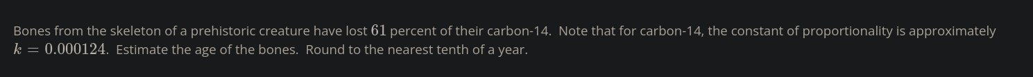39 = 100e^(-.000124t) 39/100 = e^(-.000124t) ln(39/100) = -.000124t (ln(39/100))/-.000124 = t 7593.61725692 = t 7593.6 = t