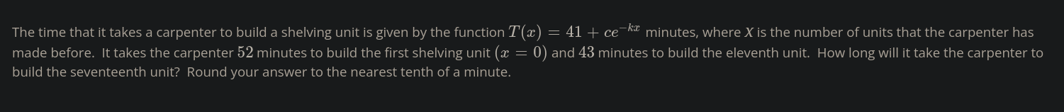 minutes = 41 + ce^(-kx) 52 = 41 + ce^(-k0) 52 = 41 + ce^(0) 52 = 41 + c 11 = c