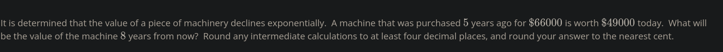 ce^-kt 49000 = 66000e^(-5k) (49000/66000) = e^-5k ln(49000/66000) = -5k (ln(49000/66000))/-5 = k 0.0595668887832 = k
