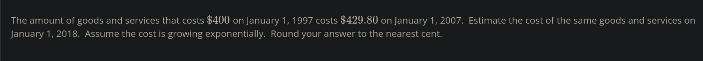 429.8 = 400e^10k 429.8/400 = e^10k ln(429.8/400) = 10k ln(429.8/400)/10 = k 0.00718554371004 = k