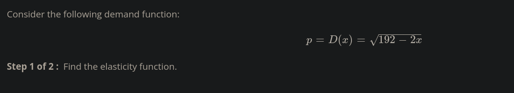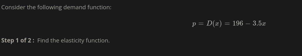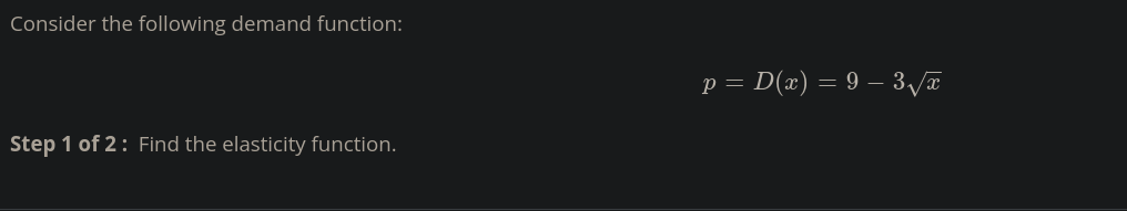 as price increases, sales decrease R(x) = demandx Elasticity = deltasales/deltaprice = (deltasales/sales)/(deltap/p) P/X * deltax/deltap P/x * 1/p p = D(x) E = -1/x * D(x)/D’(x)