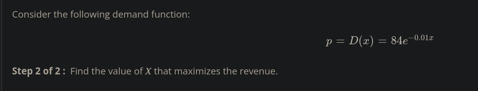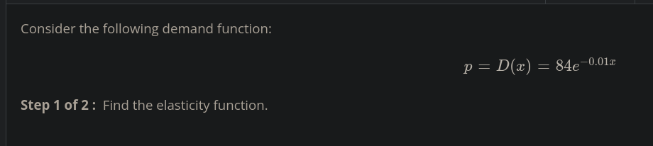 -1/x * D(x)/D’(x) -1/x * (100e^-.5x)/(100e^(-.5x) * -.5) -1/x * 1/-.5 -1/x * -2 2/x 1 = 2/x 1x = 2 x = 2
