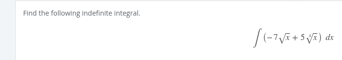 -7sqrt(x) + 5qdrt(x) -7x^(1/2) + 5x^(1/4) -7/(3/2) x^(3/2) + (5)/(5/4) x^(5/4) (-7)(2/3)x^(3/2) + (5)(4/5)x^(5/4) (-14/3)x^(3/2) + (20/5)x^(5/4) (-14/3)x^(3/2) + 4x^(5/4) + c