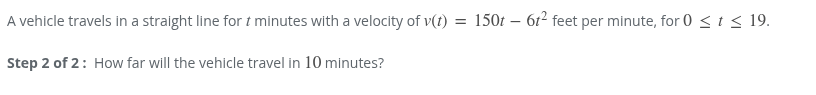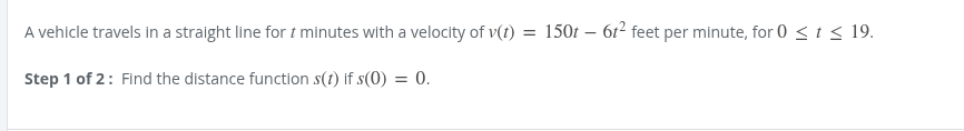 150t - 6t^2 find antiderivative ( velocity is derivative of distance ) (150/2)t^2 - 6/3 t^3 75t^2 - 2t^3 + c