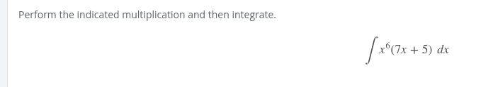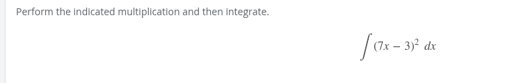 (7x-3)^2 (7x-3)(7x-3) 49x^2 -21x -21x + 9 49x^2 -42x + 9 now integrate