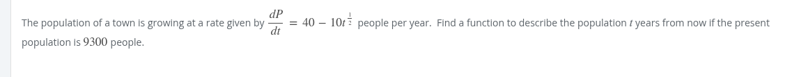 40t- (10/(3/2))t^(3/2) 40t - (10)(2/3)t^(3/2) 40t - (20/3)t^(3/2) + c 40(0) - (20/3)(0)^(3/2) + c = 9300 0 - 0 + c = 9300 c = 9300