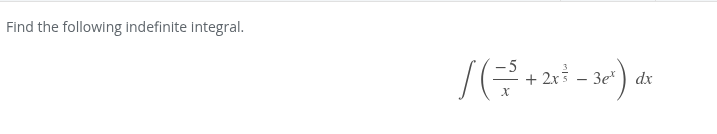 integrate -5ln|x| + (2/(8/5))x^(8/5) - 3e^x -5ln|x| + (2)(5/8)x^(8/5) - 3e^x -5ln|x| + 10/8x^8/5 -3e^x + c -5ln|x| + (10/8)x^(8/5) -3e^x + c -5ln|x| + (5/4)x^(8/5) -3e^x + c