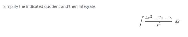 4x^2/x^2 - 7x/x^2 - 3/x^2 4 - 7x/x^2 - 3/x^2 4 - 7x(x^-2) - 3(x^-2) 4 - 7x^-1 - 3x^-2 integrate!