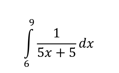 1/5 integral(9,6) 1/(5x+5) * 5dx we have 1/5 int(9,6) 1/u 1/5 ln|u| 1/5 ln|5x+5| integral(9,6) plug in 9 - plug in 6