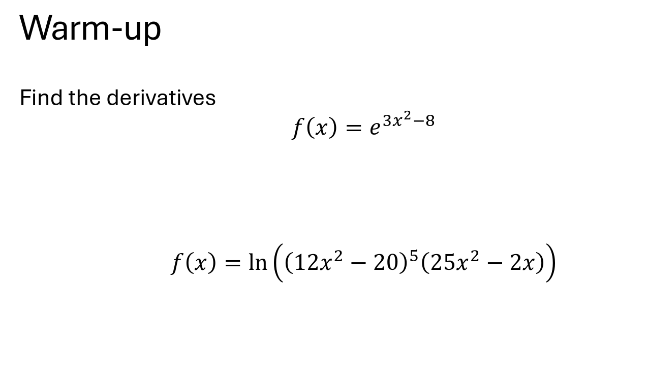 5ln(12x^2-20) + ln(25x^2-2x) 5 * (1/12x^2-20) * 24x + 1/(25x^2-2x) * 50x - 2 (120x) / (12x^2-20) + (50x-2)/25x^2-2x