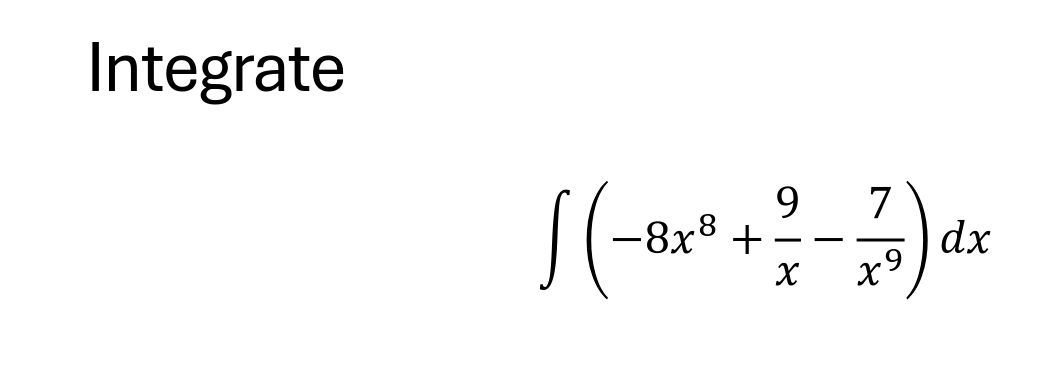 (-8x^9)/9) + 9ln(|x|) - 7(x^-8/-8) + c -8/9 x^9 + 9ln(|x|) - (7x^-8)/-8 + c -8/9x^9 + 9ln(|x|) - 7/8x^8 + c