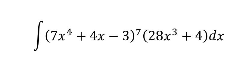 u = (7x^4+4x-3) du = (28x^3 + 4)dx now we do u * du 28x^3 + 4 already matches up integral u^7 du u^8/8 + c ((7x^4+4x-3)^8)/8 +c