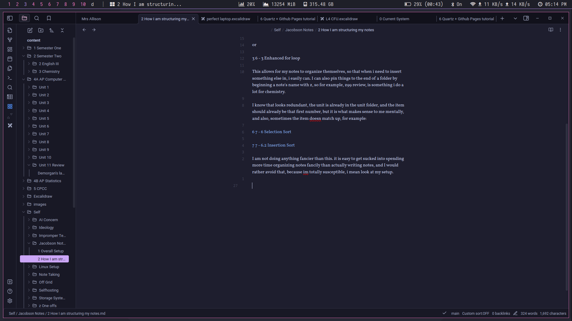 All of my notes are within my quartz content folder Each Semester has a folder, for all my 4x4 classes from that semester. A day B day classes also have their own seperate folders Each year I make a fresh new vault, to avoid clogging things up.