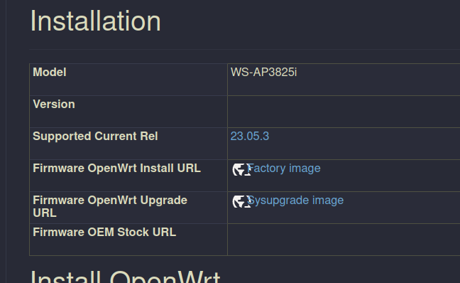 i right click on the sysupgrade image link and i copy link. You should do this yourself because there may be a newer version available than the version at time of writing. currently thats https://downloads.openwrt.org/releases/23.05.3/targets/mpc85xx/p1020/openwrt-23.05.3-mpc85xx-p1020-extreme-networks_ws-ap3825i-squashfs-sysupgrade.bin