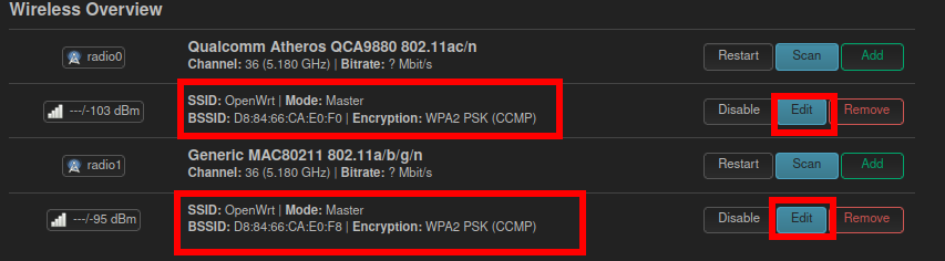 option commonname 'OpenWrt'once you make all those files say all those things, reboot. wifi should just work immediately.
