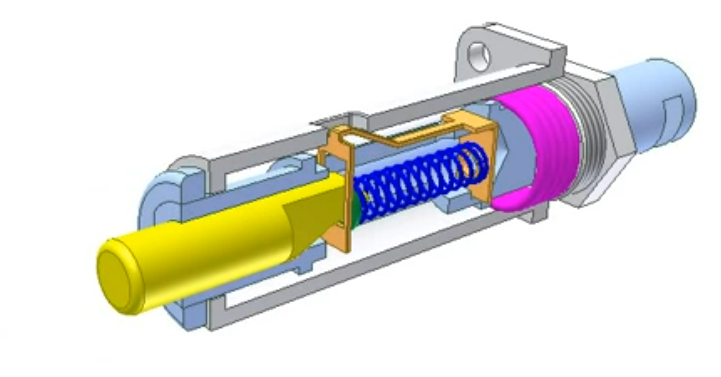 idea is - spring stores energy when i slot the thing in, so when I press on the thing later to open it back up, spring reaches a point where the energy can be released and then it springs forward, opening my drawer.